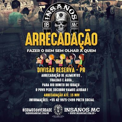 Utilidade Pública Insanos Motoclube, Divisões Reserva I e II, está promovendo arrecadação de alimentos, fraldas e água potável para as famílias de Rio Bonito do Iguaçu novembro 9, 2025